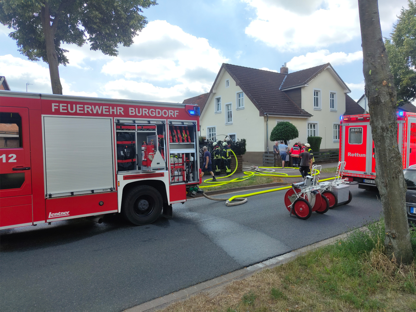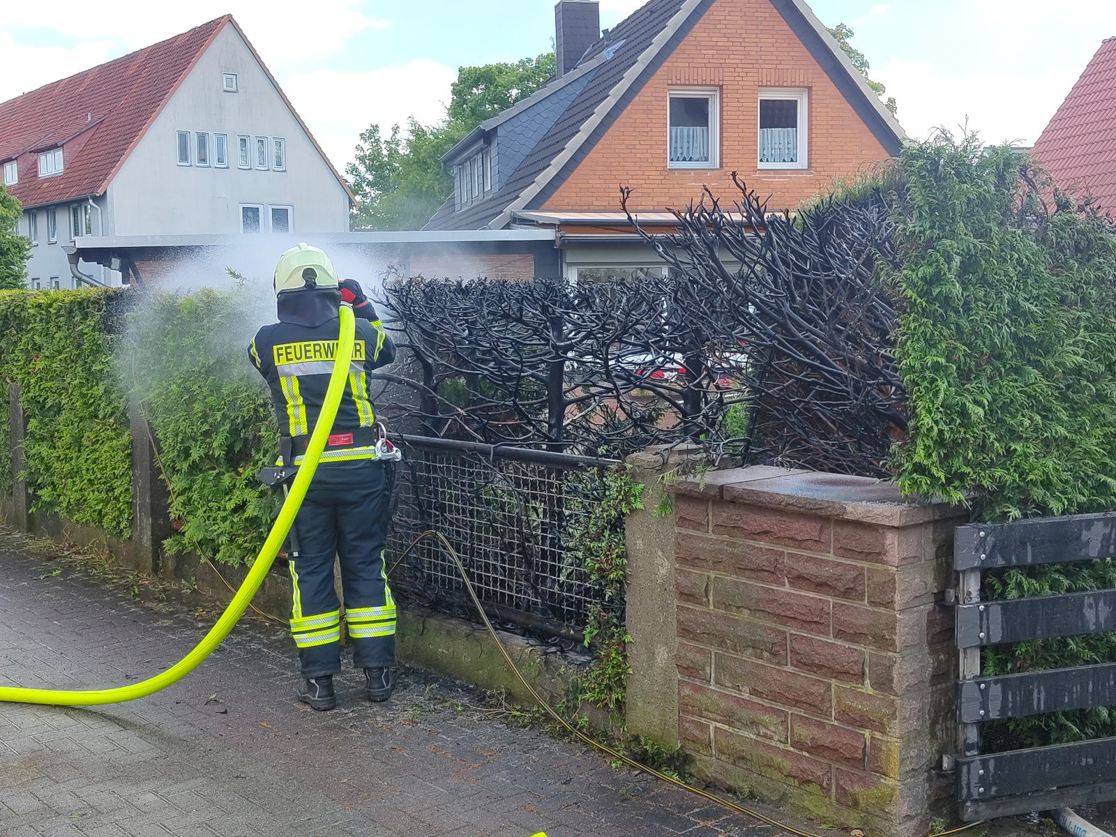 Eine Hecke brannte an einem Gebäude. Der Anwohner leitete bereits erste Löschmaßnahmen mit einem Gartenschlauch ein. Mit 2 C-Rohren und insgesamt ca. 1500L Wasser, wurde die Hecke endgültig gelöscht und mit einer Wärmebildkamera nachkontrolliert.