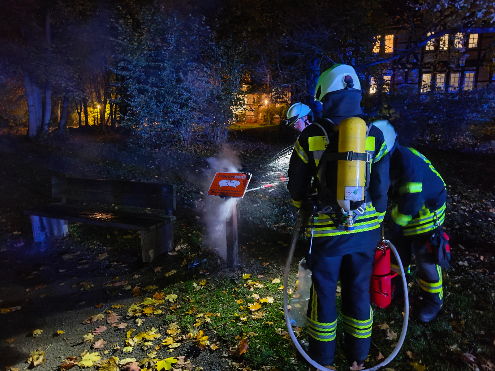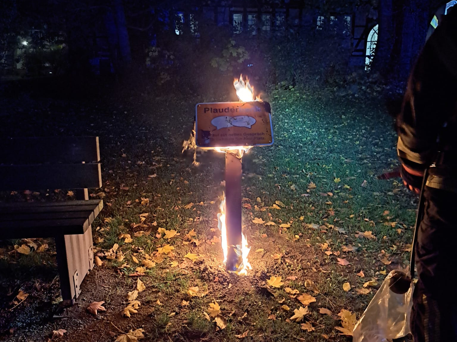 Im Stadtpark brannte ein Infoschild aus Plastik und Holz. Mit ca. 40 Litern Wasser wurde das Schild abgelöscht und die Einsatzstelle konnte schnell an die Polizei übergeben werden.