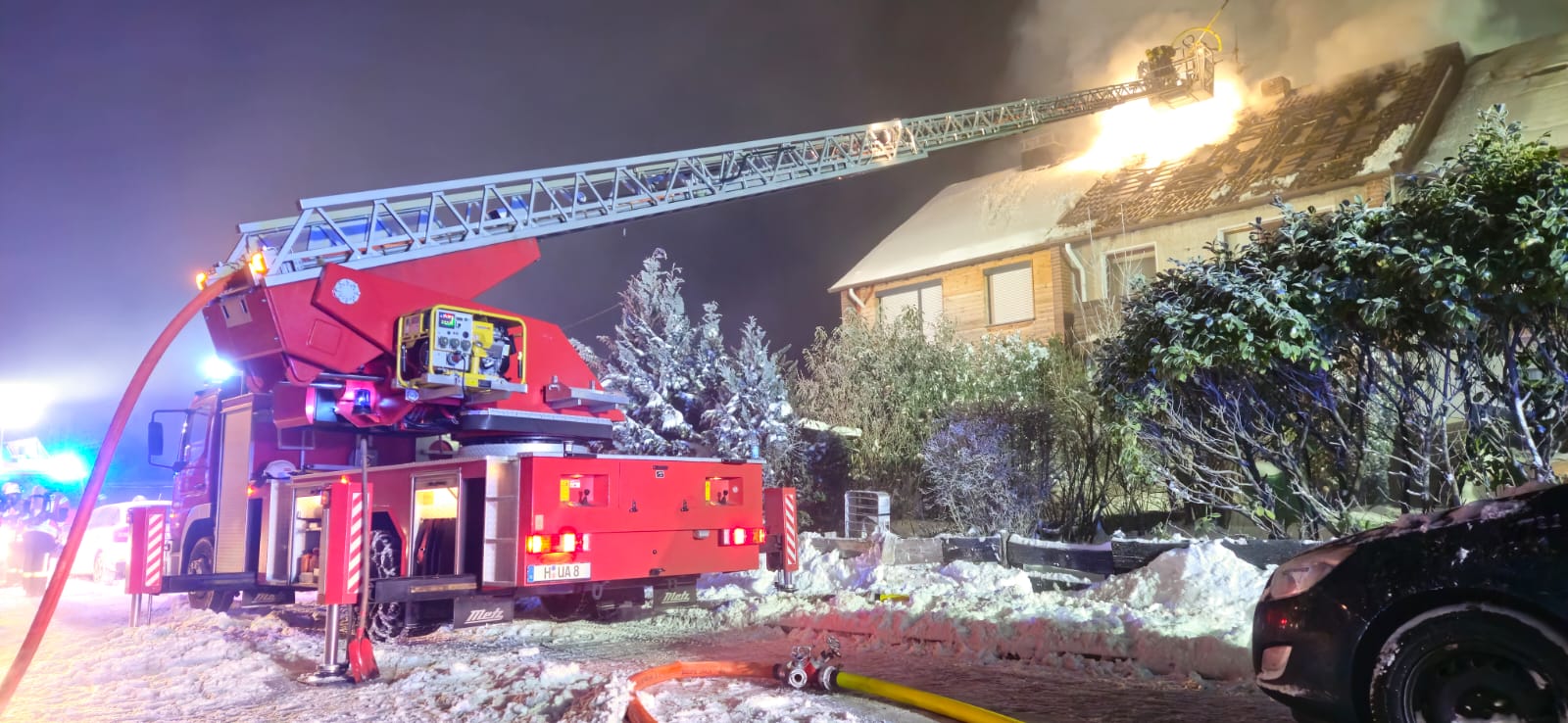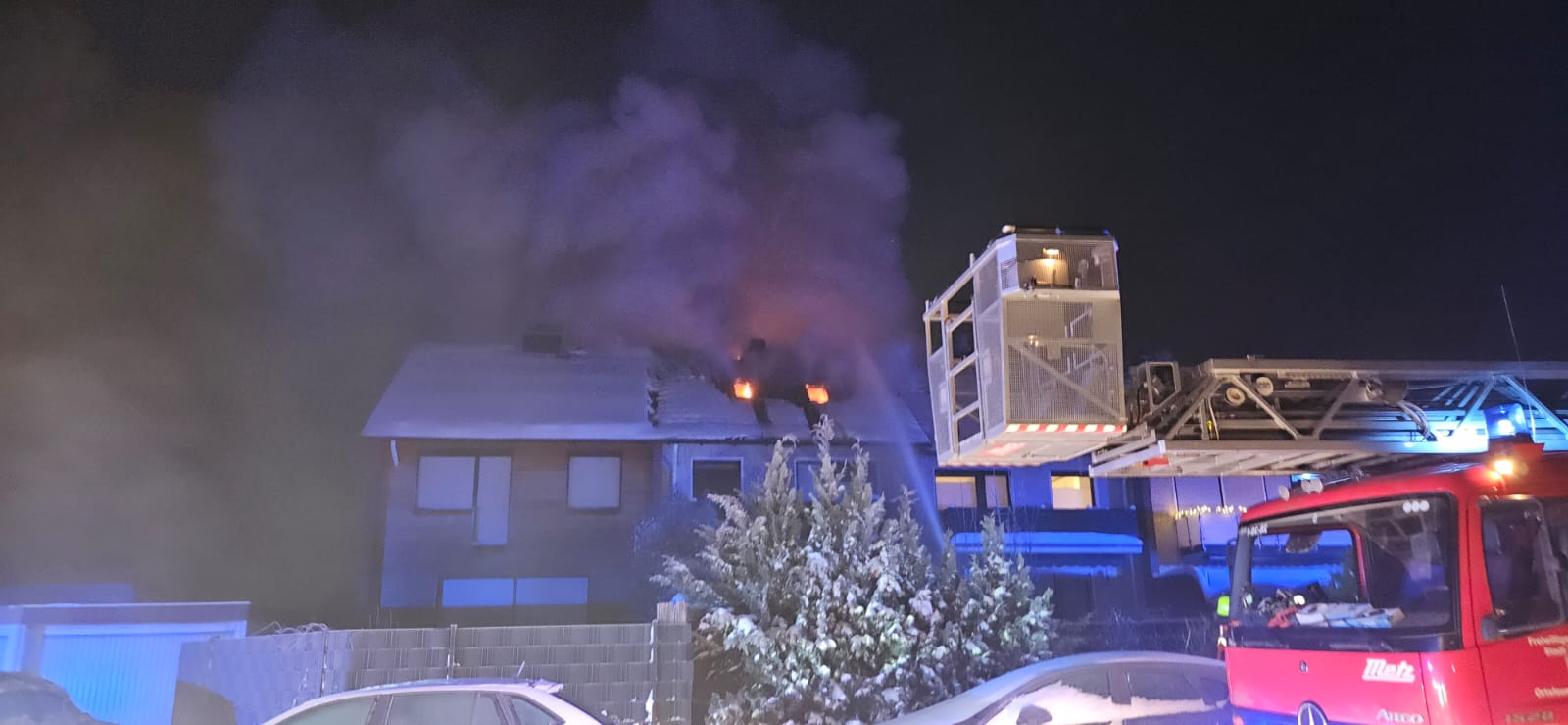 Bei einem Reihenmittelhaus brannte der Dachstuhl. Über die Drehleiter wurde dieser weiter geöffnet und das Feuer direkt gelöscht. Parallel gingen Trupps unter Atemschutz in das Gebäude vor und bekämpften das Feuer von innen.