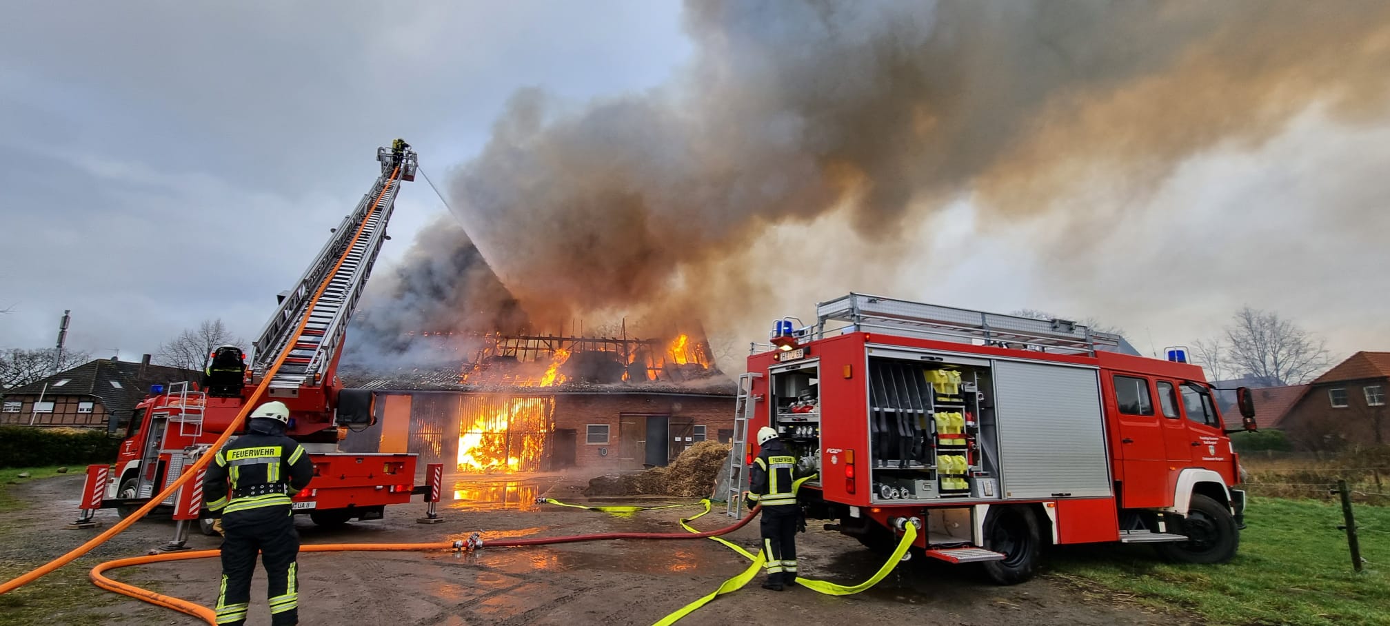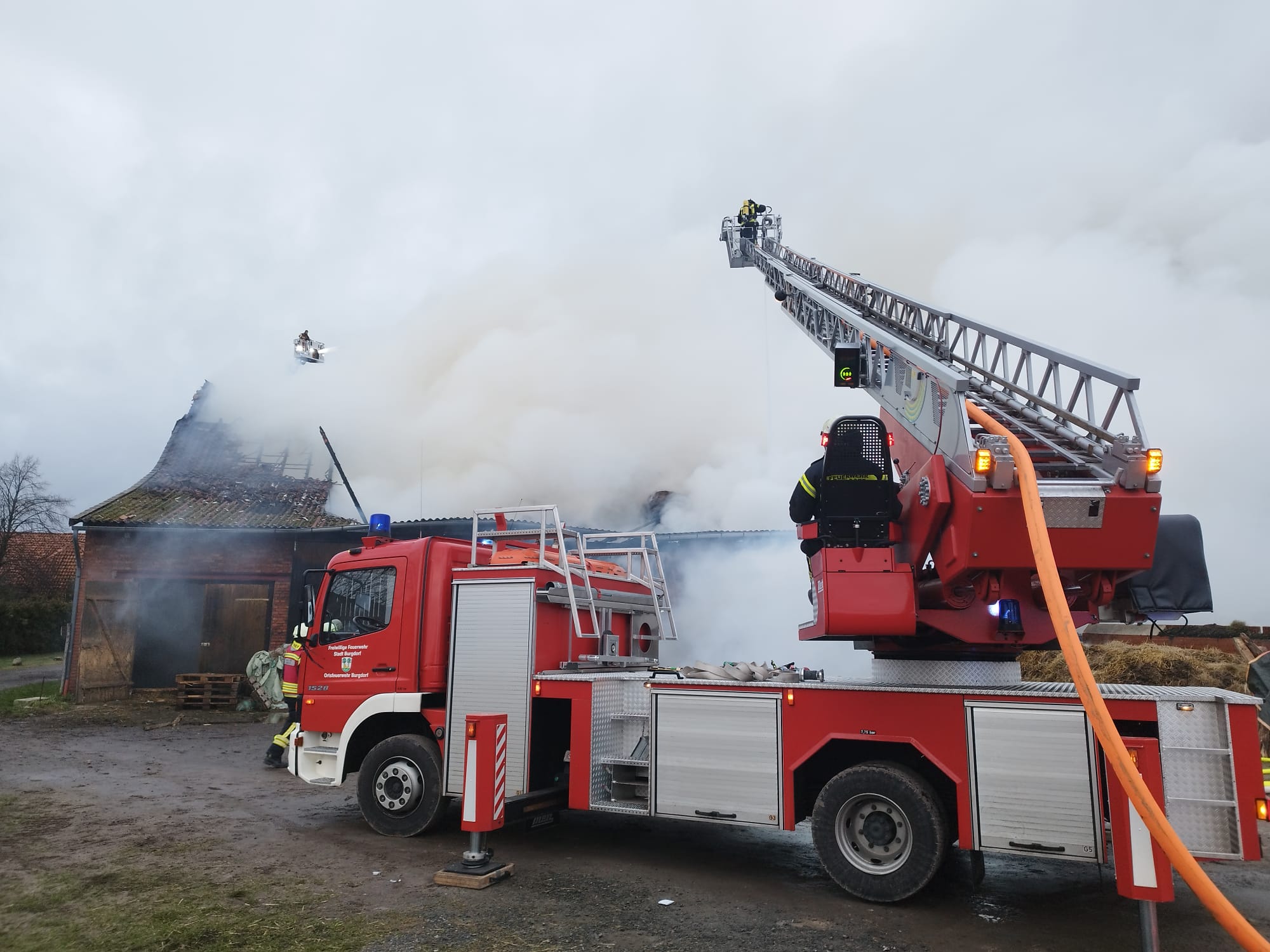Wir wurden gemeinsam mit den Feuerwehren aus Burgwedel nach Thönse alarmiert zu einem Scheunenbrand. Auf Anfahrt bestätigte sich die Meldung und es wurde die Alarmstufe erhöht.