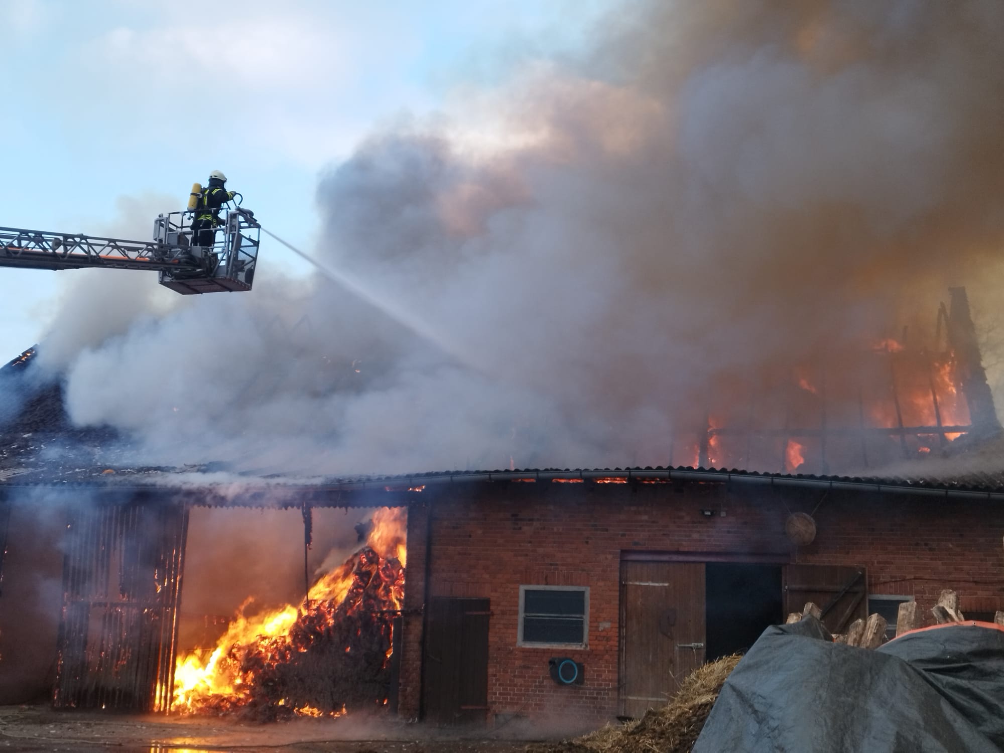 Vor Ort gaben wir über mehrere Stunden mit mehreren Atemschutzgeräteträgern Wasser über das Wenderohr der Drehleiter ab. Das TLF stellte dabei weiteres Personal für die Drehleiter und eine Pumpe, mit der die Leiter gespeist wurde.