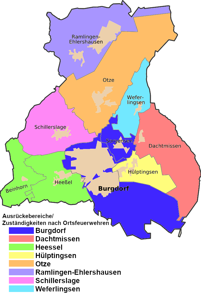 Seit dem 31.10.1871 wird der Brandschutz in der Stadt Burgdorf wird zu 100% ehrenamtlich sichergestellt. Berufsfeuerwehren gibt es erst in Städten mit über 100.000 Einwohnern.In Burgdorf ist grundsätzlich die jeweilig ortsansässige Feuerwehre in ihrem Ort zuständig. Die Ortsfeuerwehr Burgdorf ist somit für das Kernstadtgebiet Burgdorf (Innenstadt, Nordstadt, Weststadt, Südstadt) und Sorgensen zuständig. Zur Vereinfachten Darstellung haben wir unten eine Karte erstellt mit den Zuständigkeiten in der Stadtfeuerwehr Burgdorf. Für die Kinder- und Jugendfeuerwehren gelten hier grundsätzlich die selben Zuständigkeiten. Da einige Ortsteile selber keine Kinder- oder Jugendfeuerwehr haben, gelten hier leicht abgeänderte Zuständigkeiten: